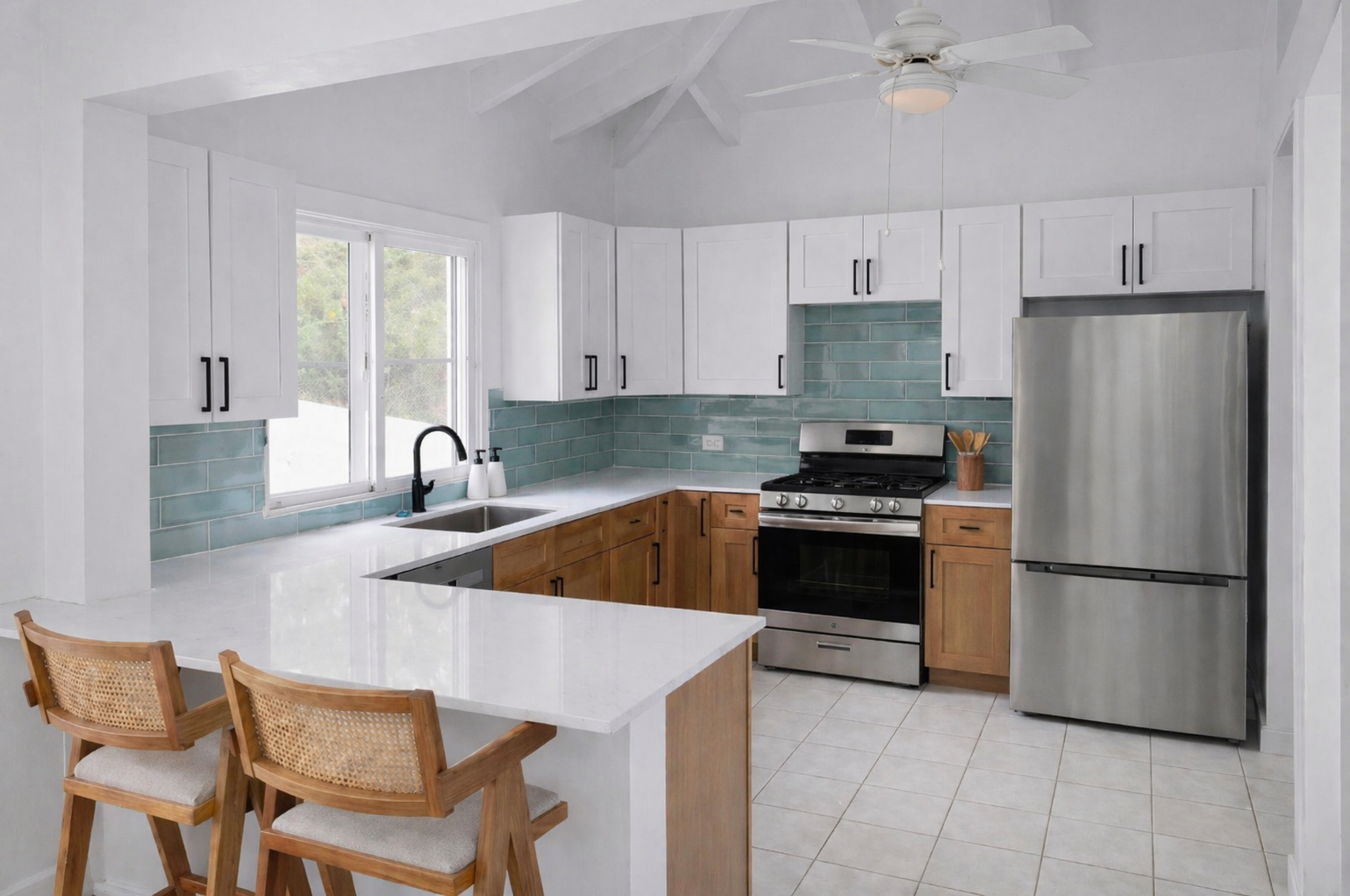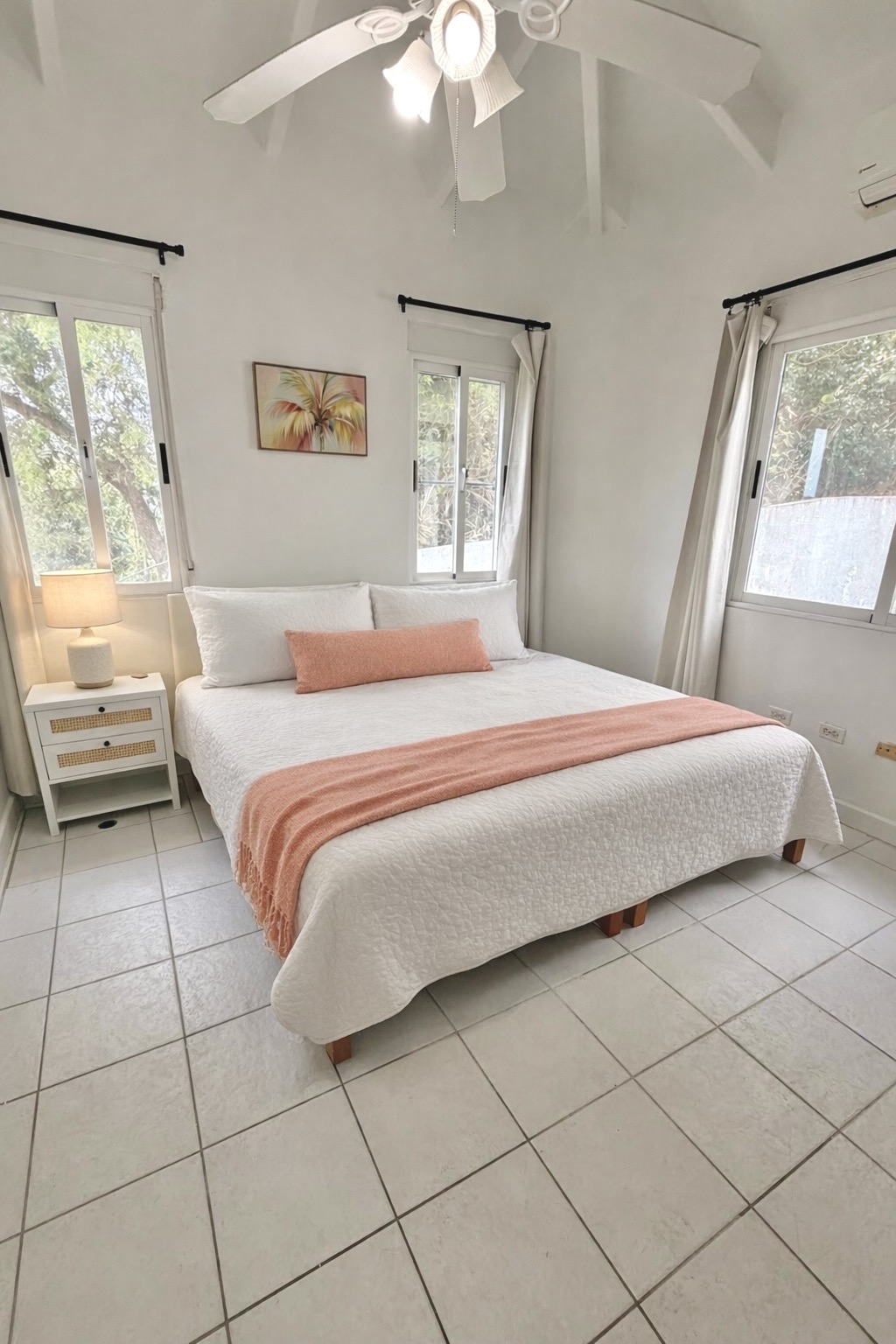 This spacious 3-bedroom home is thoughtfully designed for comfort and relaxation. The primary bedroom features a king bed, while the additional bedrooms offer flexible sleeping arrangements perfect for families or groups. The open living and dining area is bright and welcoming, with large windows that bring in natural light and ocean breezes. The fully equipped kitchen includes everything needed to prepare meals during your stay. Guests can also enjoy fast WiFi, air conditioning, comfortable seating areas, and a washer and dryer for convenience. Step outside to take in the elevated Buck Island views, relax with morning coffee, or unwind after a day exploring St. Croix. The home is located in a peaceful residential neighborhood with easy access to beaches, restaurants, shops, and island excursions just minutes away.