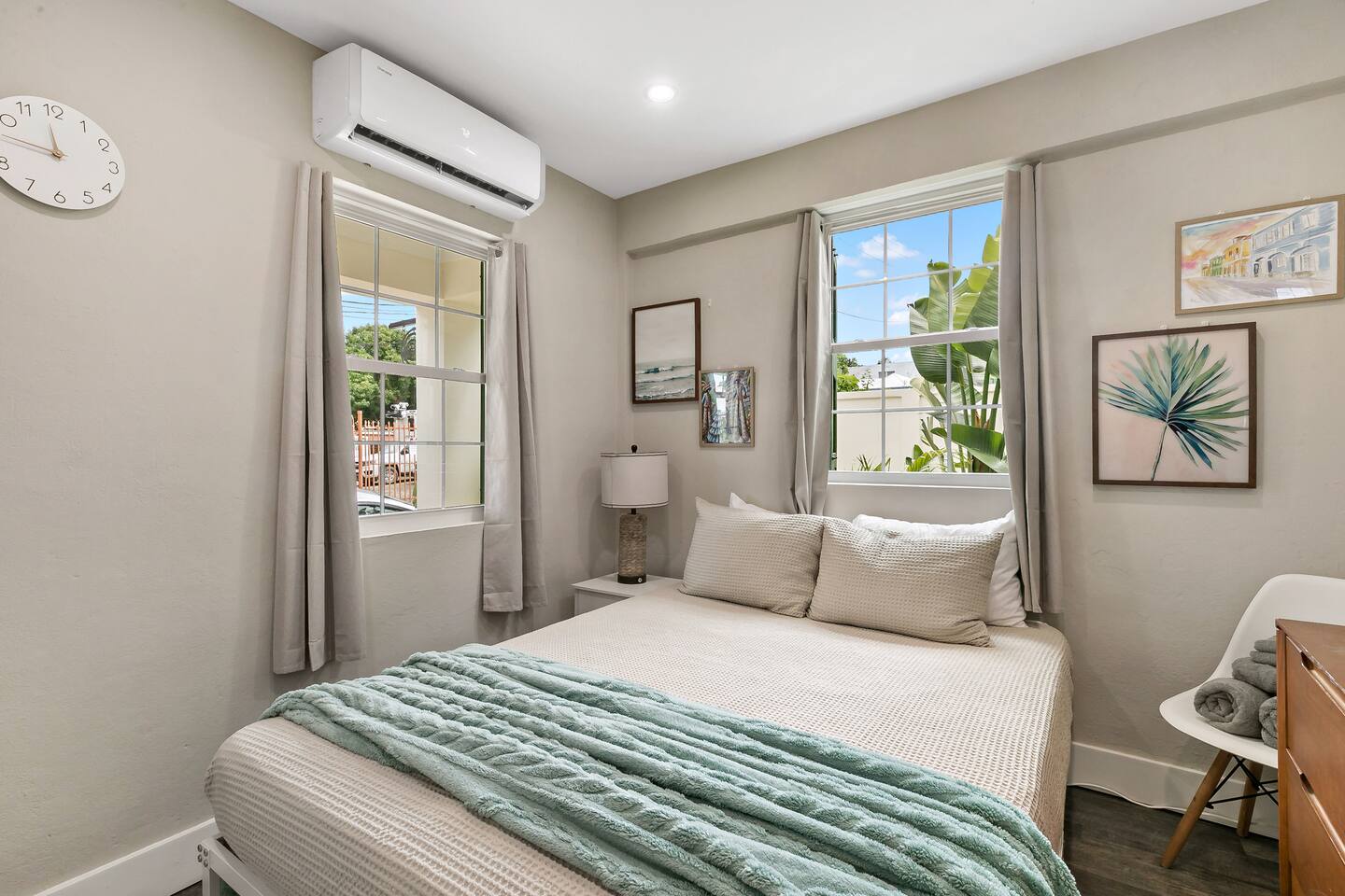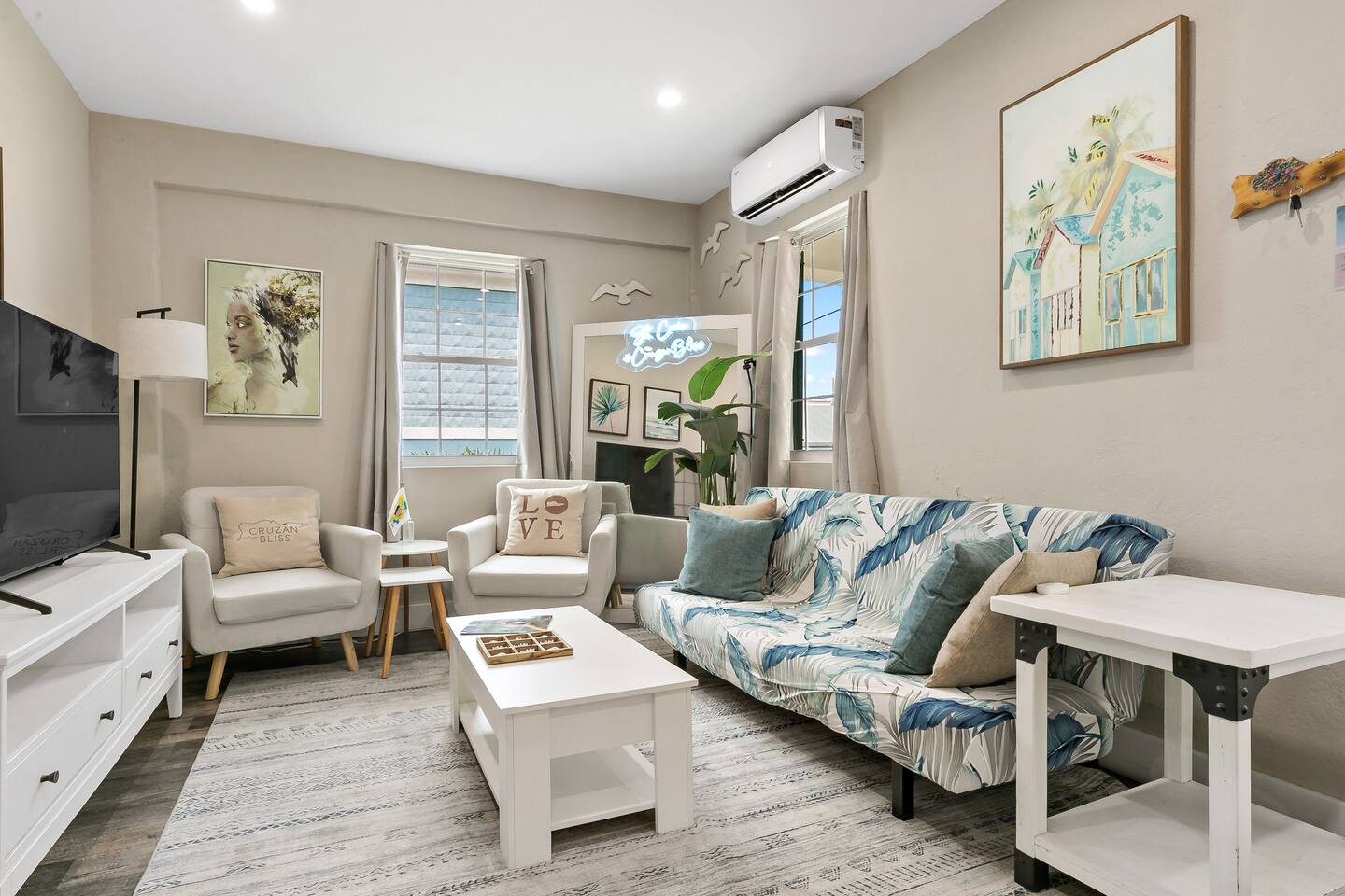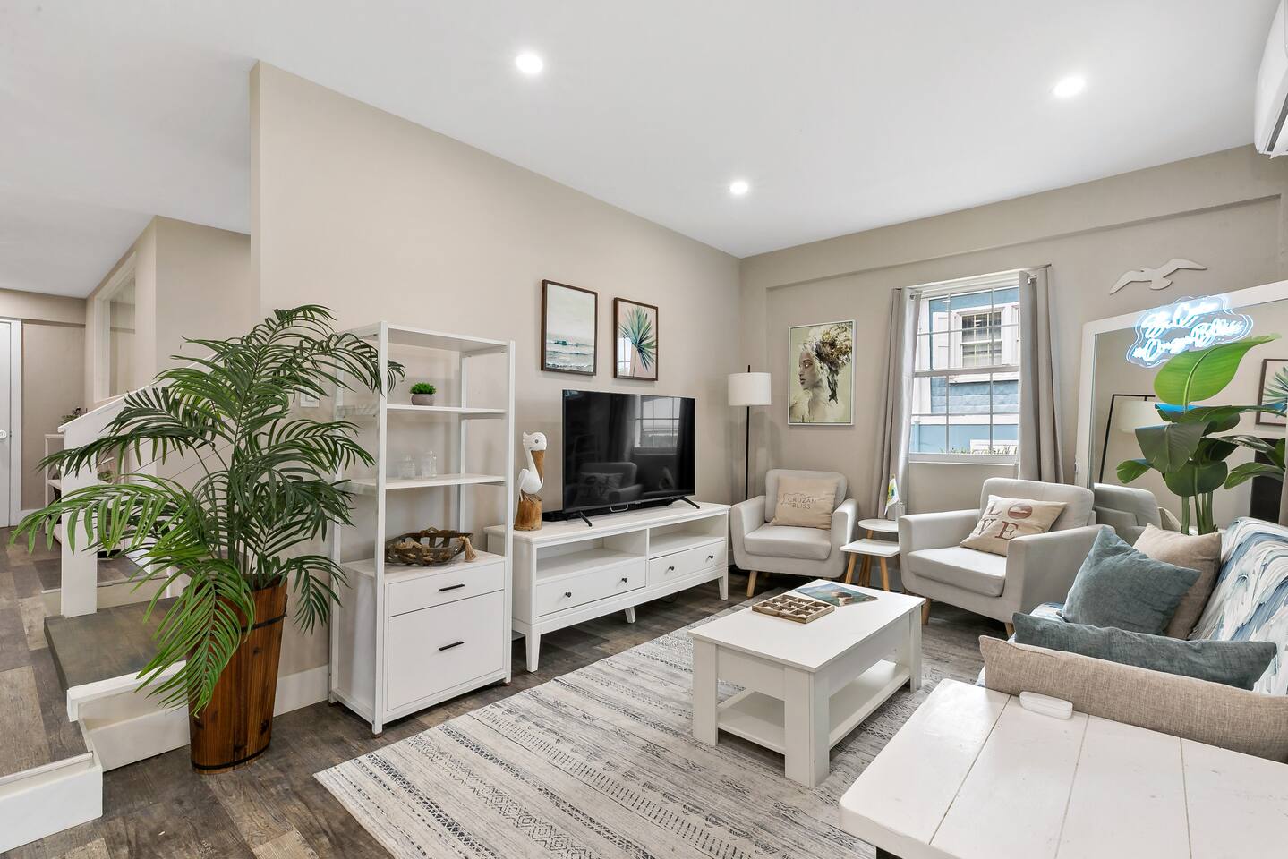 Set within a recently restored building, this charming 2-bedroom, 1-bath ground floor unit offers comfort and convenience in the heart of town. Inside, you’ll find a fully equipped kitchen ready for home-cooked meals, plus a welcoming living space perfect for gathering. Step outside to a lovely backyard, an ideal spot to enjoy your meals or relax after exploring. Walk to restaurants, shops, nightlife, the boardwalk, and ferry access to Protestant Cay, our closest beach! Full AC!