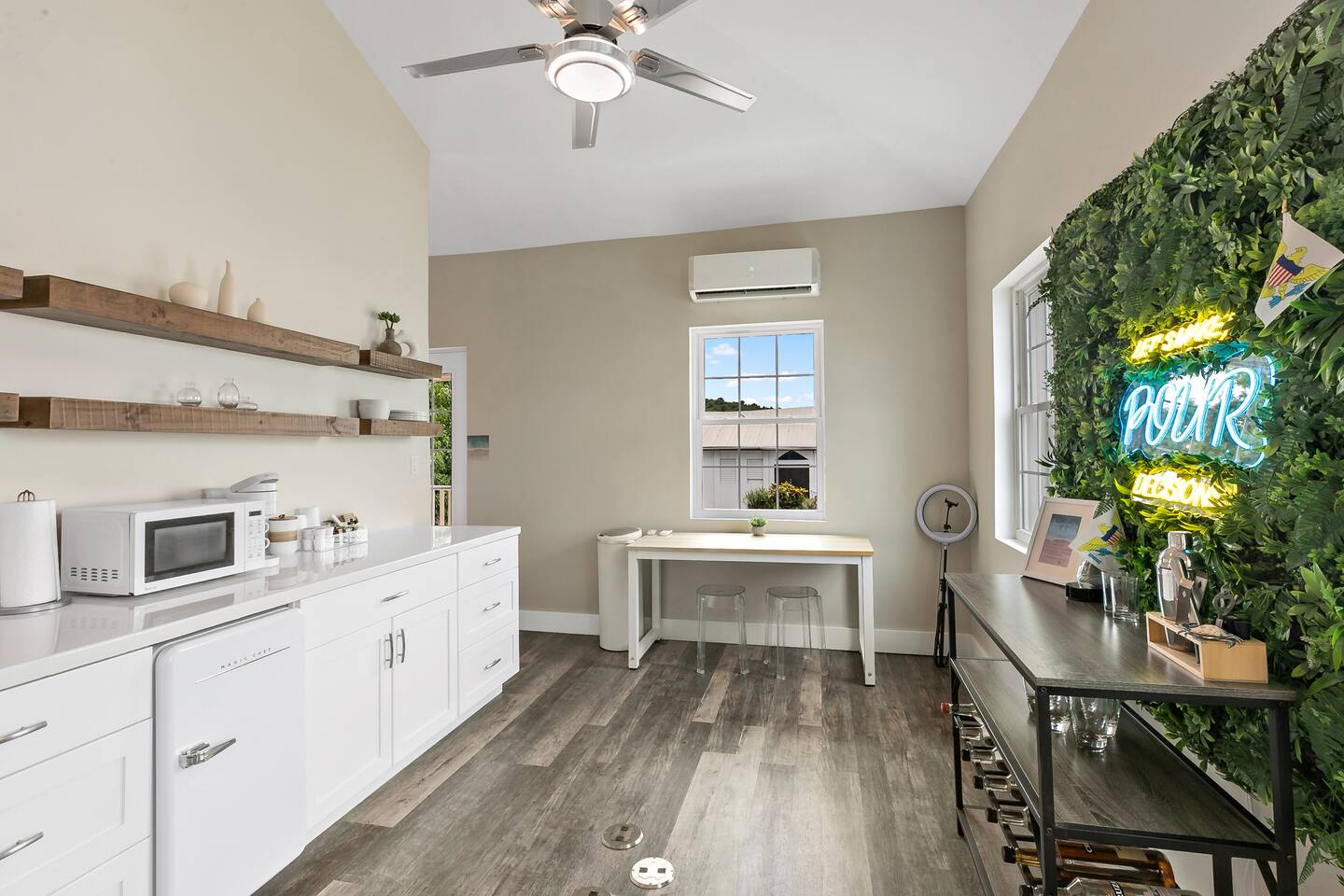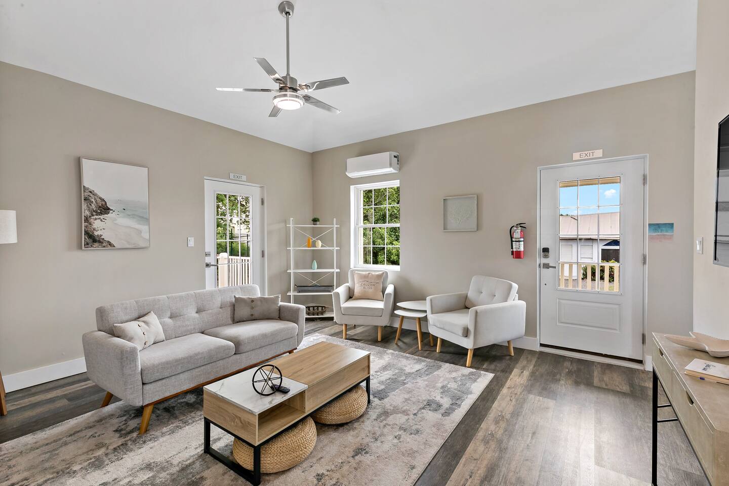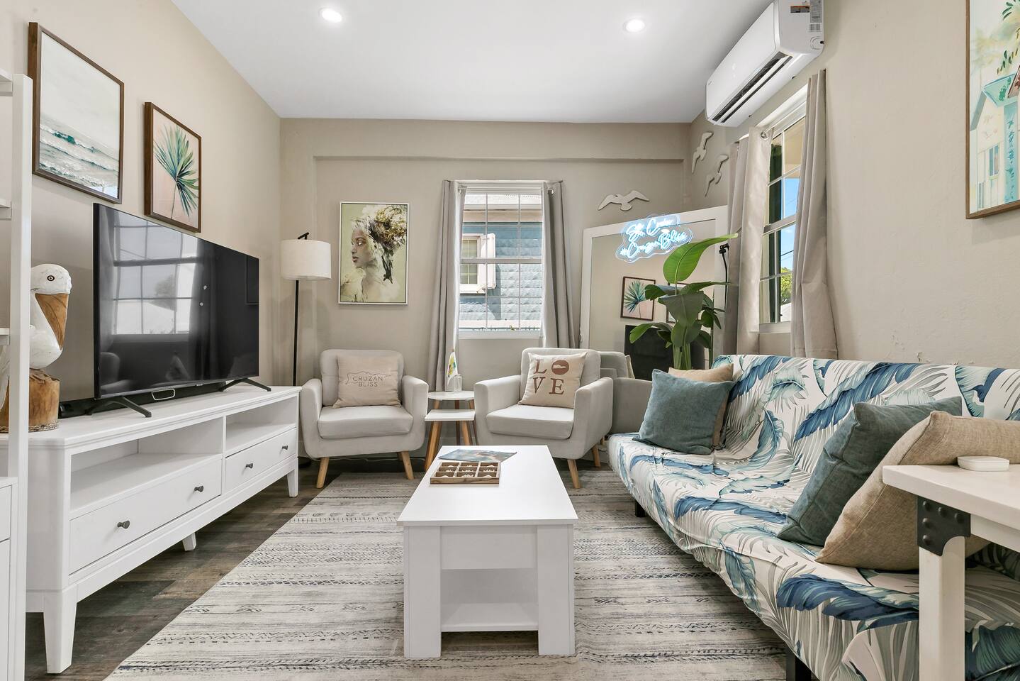 Stay in a beautifully restored building offering the full property; 3 bedrooms, 2.5 baths across two levels. Downstairs: 2 queen bedrooms, full kitchen, living room, office space, backyard, half bath + outdoor shower. Upstairs: king suite with en suite, half bath, dining & living rooms, back patio, and a kitchenette/coffee bar. Perfectly located in town, walkable to restaurants, shops, nightlife, the boardwalk, and the beach ferry. Fully AC’d