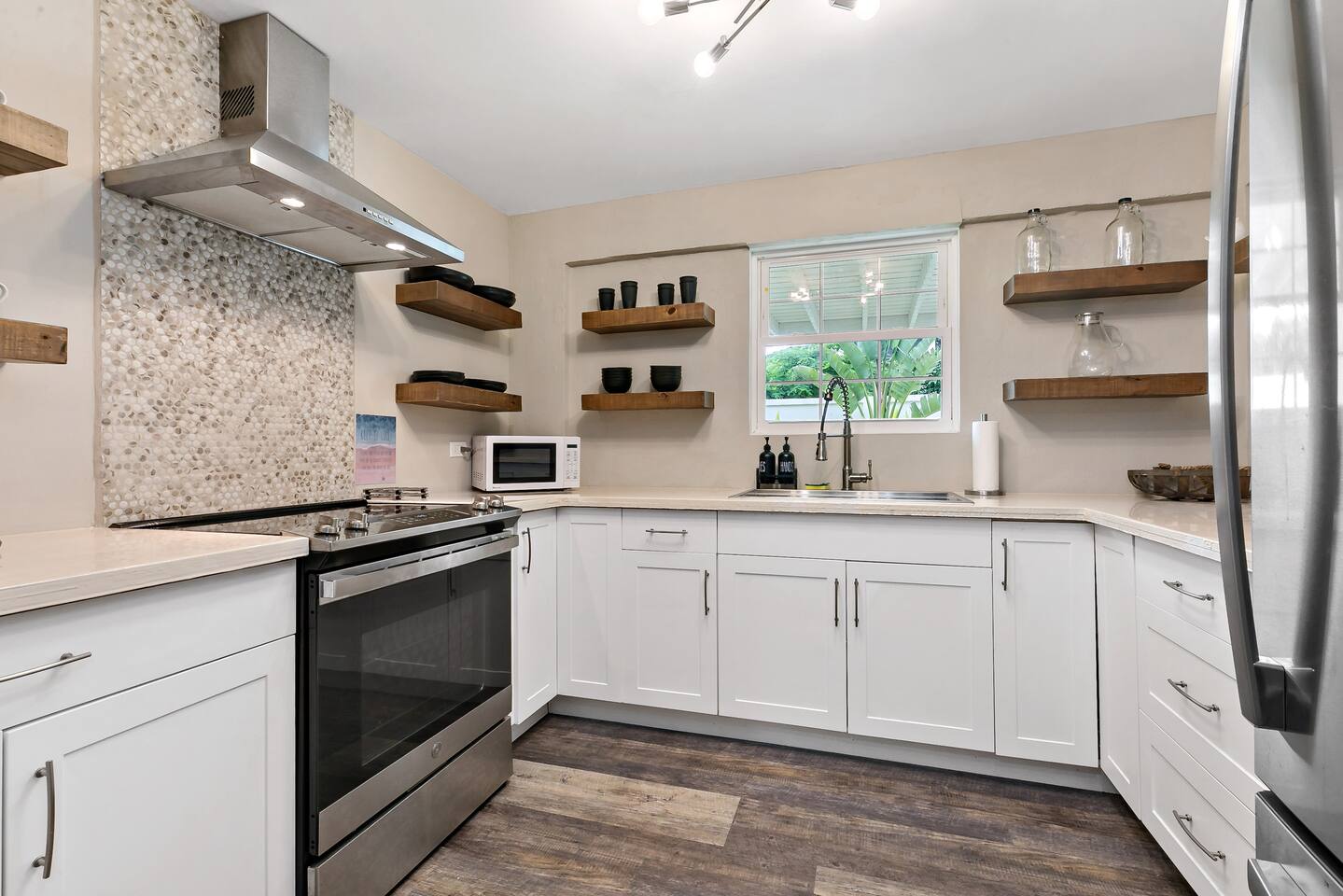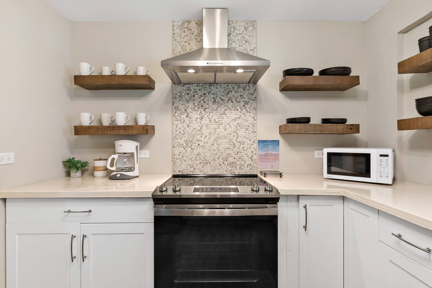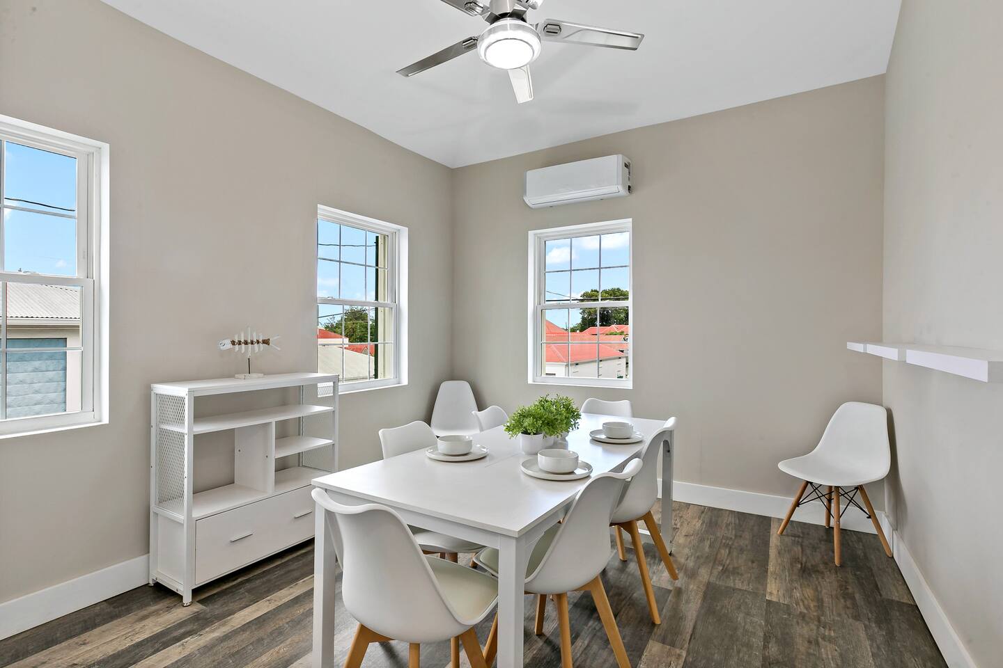 Stay in a beautifully restored building offering the full property; 3 bedrooms, 2.5 baths across two levels. Downstairs: 2 queen bedrooms, full kitchen, living room, office space, backyard, half bath + outdoor shower. Upstairs: king suite with en suite, half bath, dining & living rooms, back patio, and a kitchenette/coffee bar. Perfectly located in town, walkable to restaurants, shops, nightlife, the boardwalk, and the beach ferry. Fully AC’d
